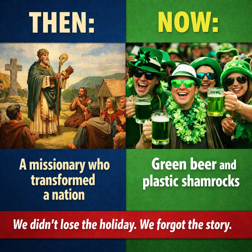 Somewhere along the way, we turned the story of a Christian missionary who transformed an entire nation… into an excuse for green decorations and drinking parties.