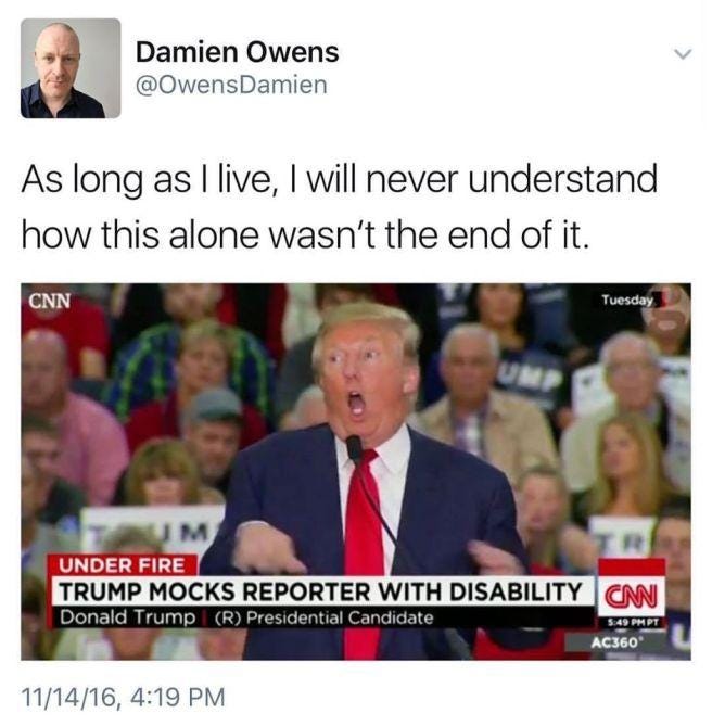 When you look at a broader set of Trump’s speeches—before and after that moment—you’ll find that he has a long pattern of using similar gestures to mock or imitate many people, not specifically tied to disability.