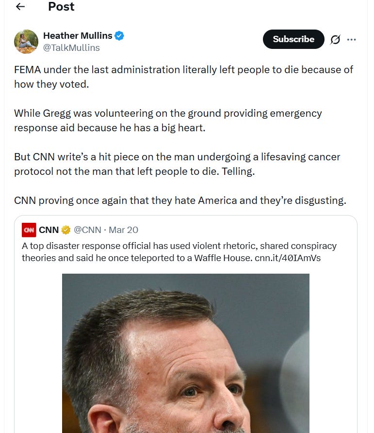 “A top disaster response official has used violent rhetoric, shared conspiracy theories and said he once teleported to a Waffle House.”