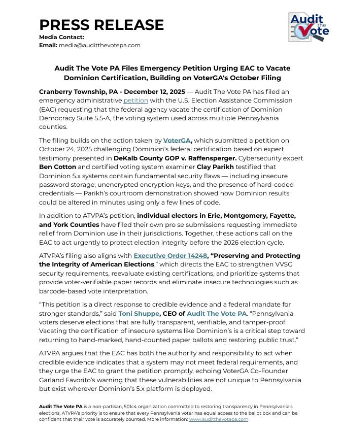 This filing builds directly on an October 2025 petition submitted by VoterGA, which presented sworn expert testimony in court identifying serious security vulnerabilities within Dominion’s 5.x platform. Those vulnerabilities were demonstrated under oath and entered into the legal record.
